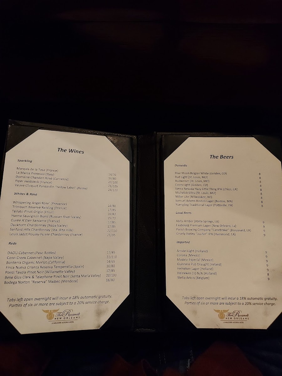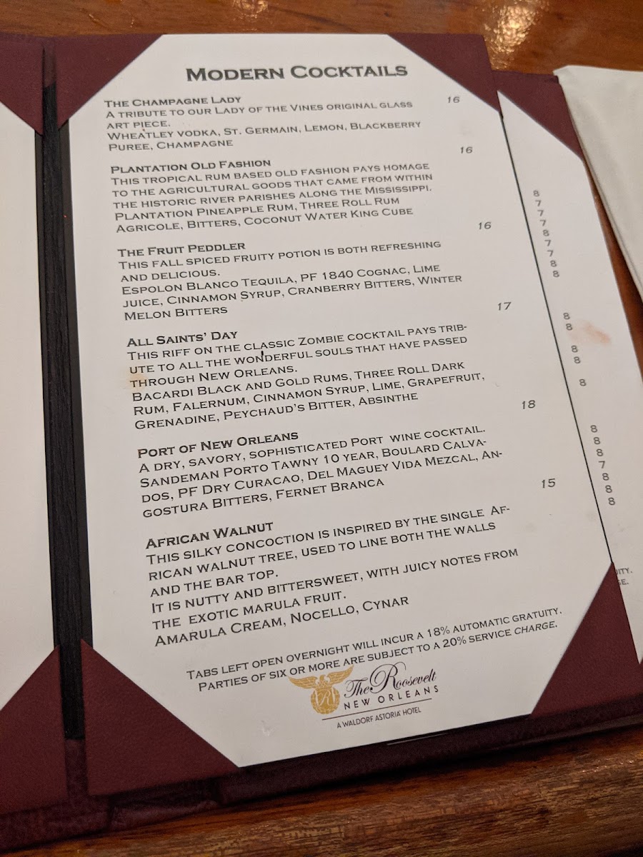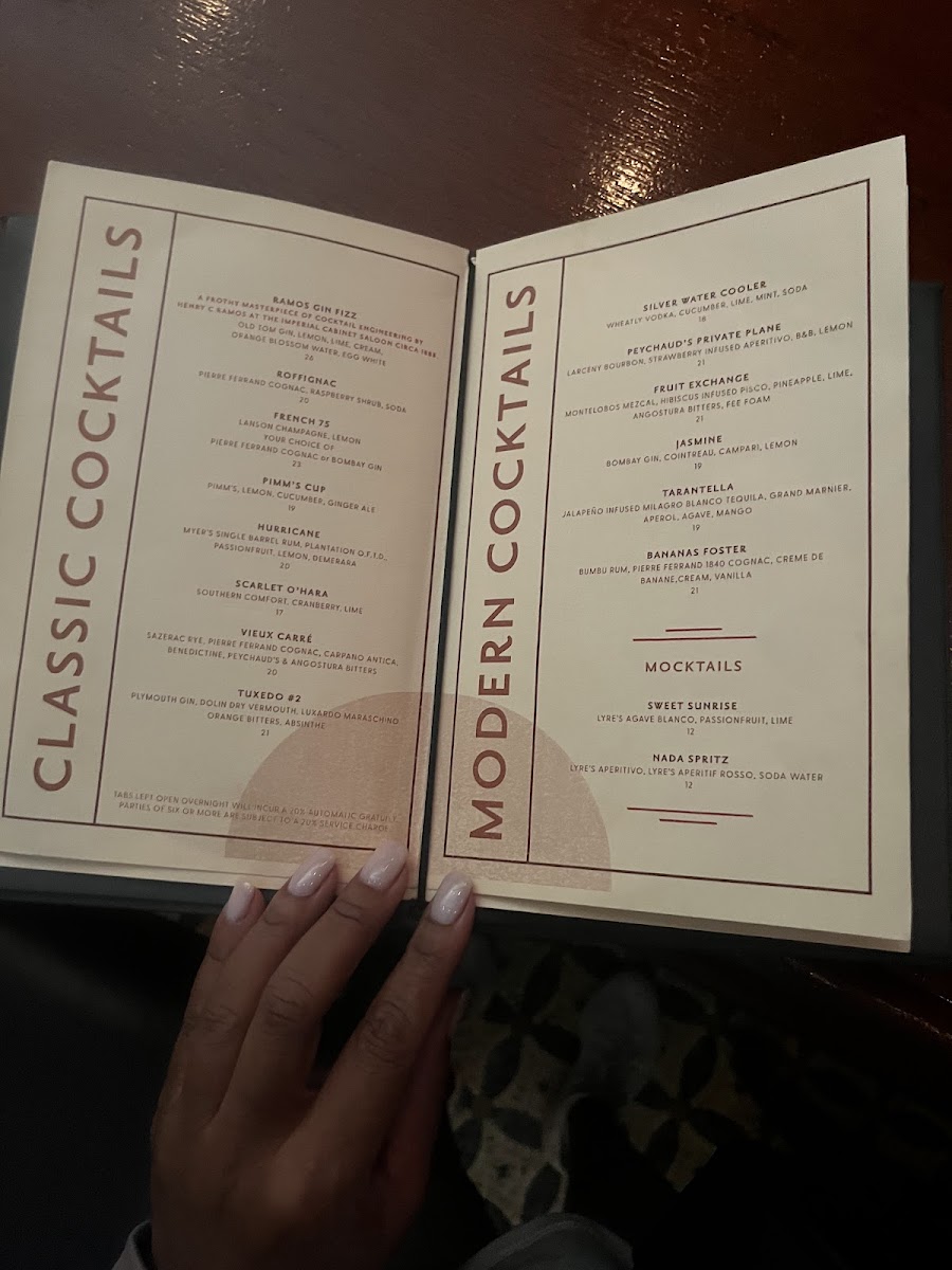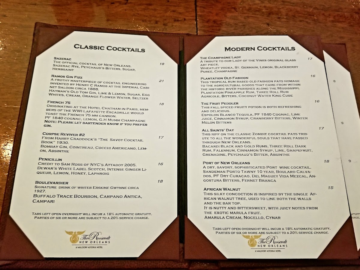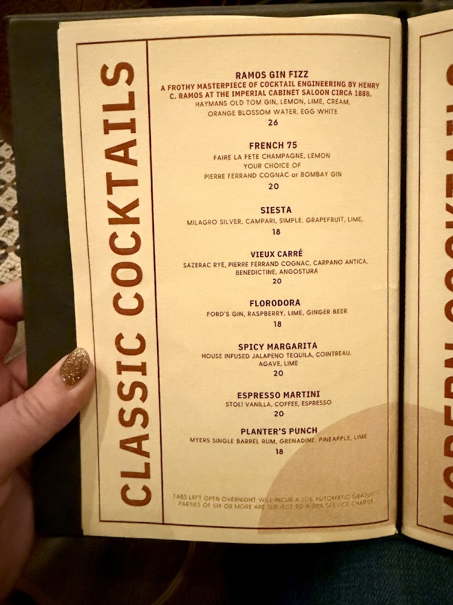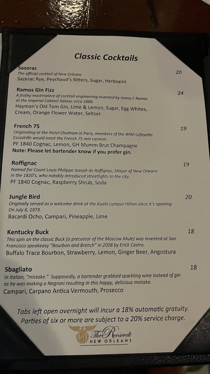 Introducing the menu at The Sazerac Bar, a New Orleans gem tucked within the Roosevelt Hotel. Here, classic cocktails meet modern creativity in an ambiance steeped in history. The highlight of the menu is undoubtedly the Sazerac, New Orleans' official cocktail, featuring Sazerac rye and Peychaud's bitters—an absolute must-try at $19. Another standout is the Ramos Gin Fizz, a frothy cocktail masterpiece that blends Hayman’s Old Tom Gin with citrus and cream for $23.